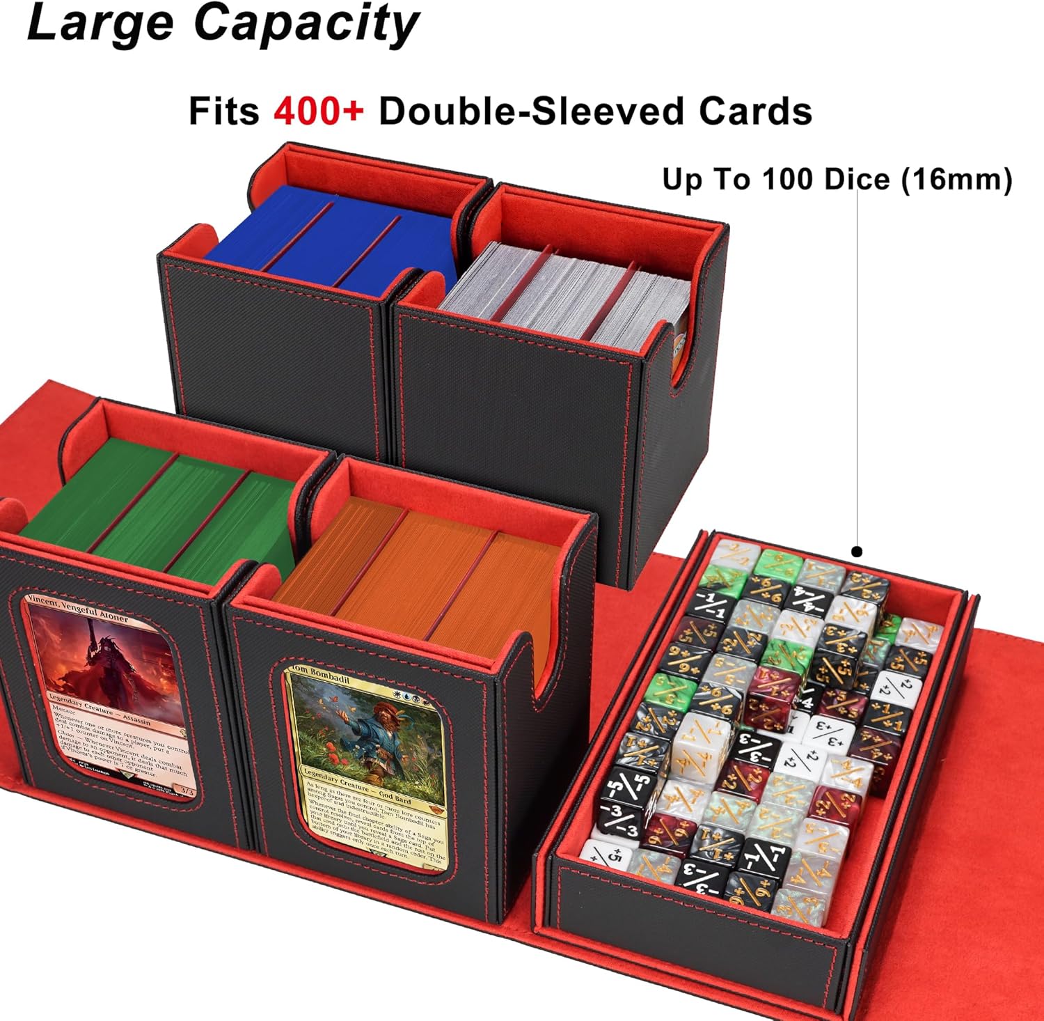 - Large Capacity – Card Storage Box for MTG & More:Fits 400+ double-sleeved cards, with each inner case holding up to 100 cards. Compatible with unsleeved, single-sleeved, and double-sleeved decks—ideal as an MTG card holder, EDH deck box, or storage solution for various trading card games and collectible card games (TCG/CCG).