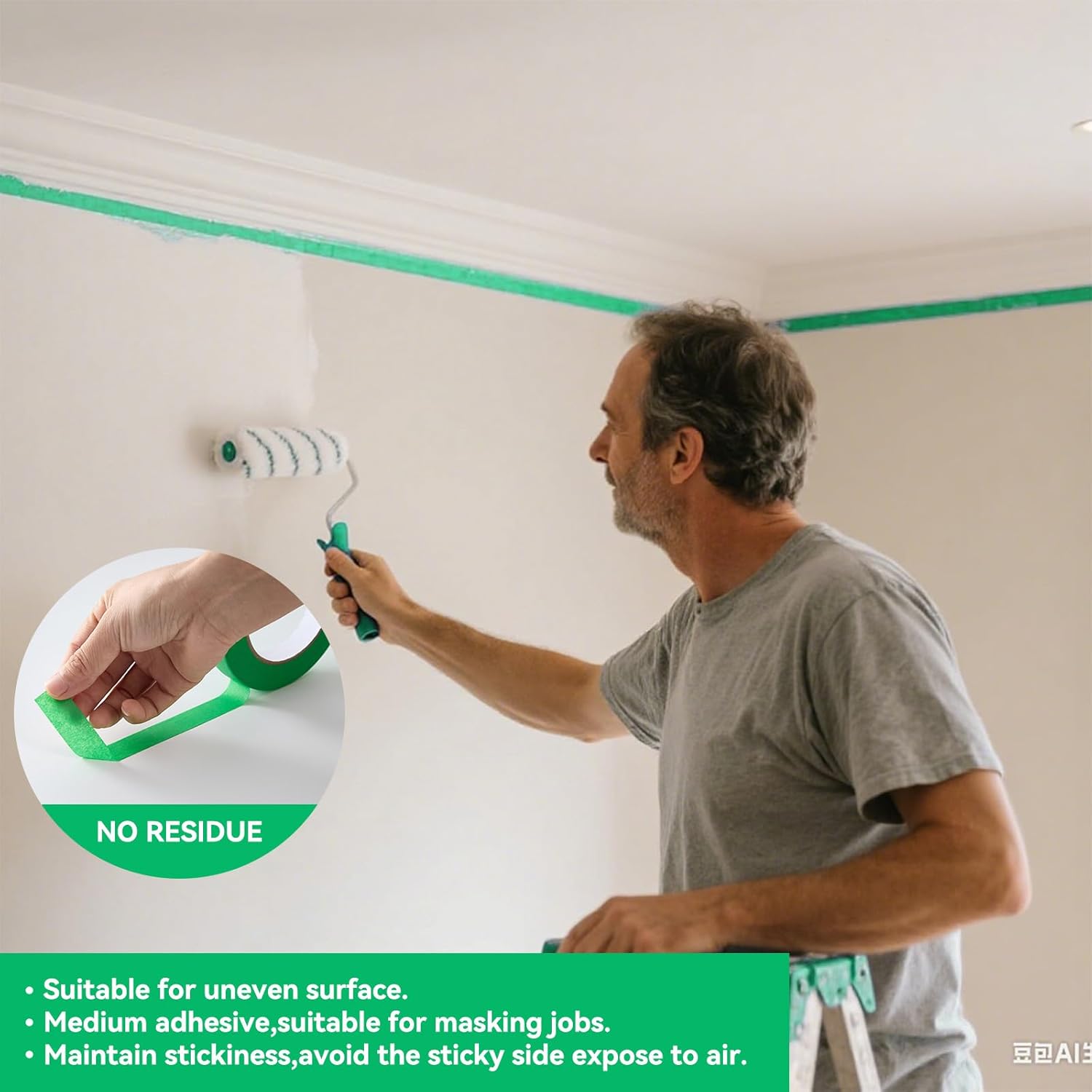 - Professional-grade masking tape: crafted from premium green crepe paper, designed to resist lifting, curling, sunlight, heat, and moisture for durable indoor/outdoor performance. This eco-friendly painters' tape uses non-toxic materials, ensuring safety while minimizing environmental impact. Ideal for packaging, sealing, and light-duty masking, its 0.7-inch width offers versatile application.