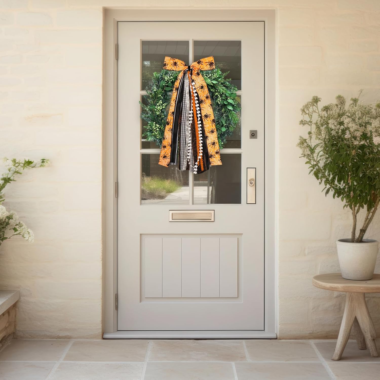 Large Halloween Ribbon Bow for Wreath, Orange Spider Web Fabric Ribbons Set Assorted Ribbons Black White Stripe Plaid Clip-On Wreath Sash Ribbon Bundle for Halloween Home Indoor Outdoor Decor