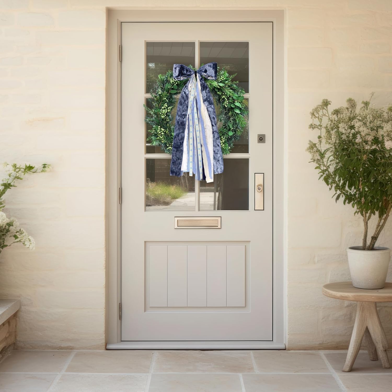 Large Blue Velvet Ribbon Bow for Wreath, Vintage Solid Fabric Ribbons Set Assorted Lace Ribbons Blue White Clip-On Wreath Sash Ribbon Bundle for Winter Christmas Home Indoor Outdoor Decor