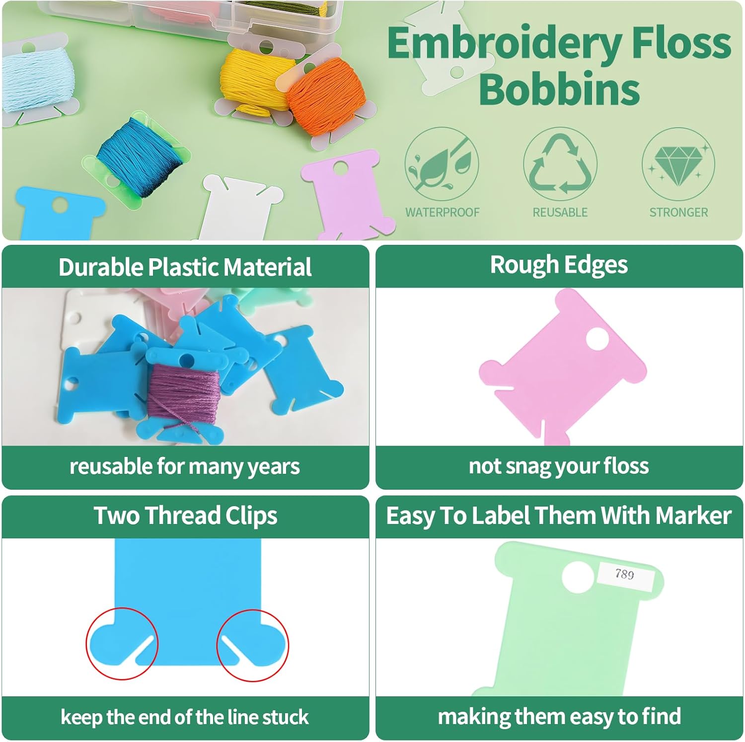 - [Premium Floss Bobbin Bobbins & Winder] The embroidery floss winders and bobbins are made of sturdy plastic, durable and not easy to break. The plastic floss bobbins are waterproof, stronger than cardboard bobbins and can be reused over and over again, which are designed with considerate parts on both ends, fixing the threads and will not slip off easily. The bobbin winder is designed as a plastic manual crank, suitable for cross stitch organizers thread holders, helping you organize different colored remaining threads, prevent them from entanglement