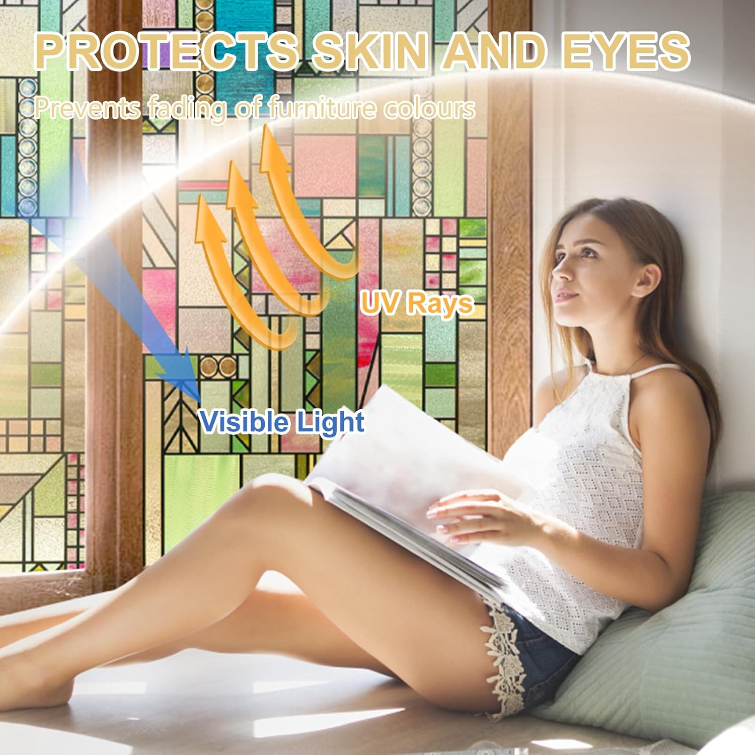 - Effective UV Blocking and Heat Control-This decorative stained glass window film effectively blocks UV rays while still allowing natural light to pass through. Dynamic colour changes under changing light conditions create a stunning effect that enhances enhancing the atmosphere indoors.