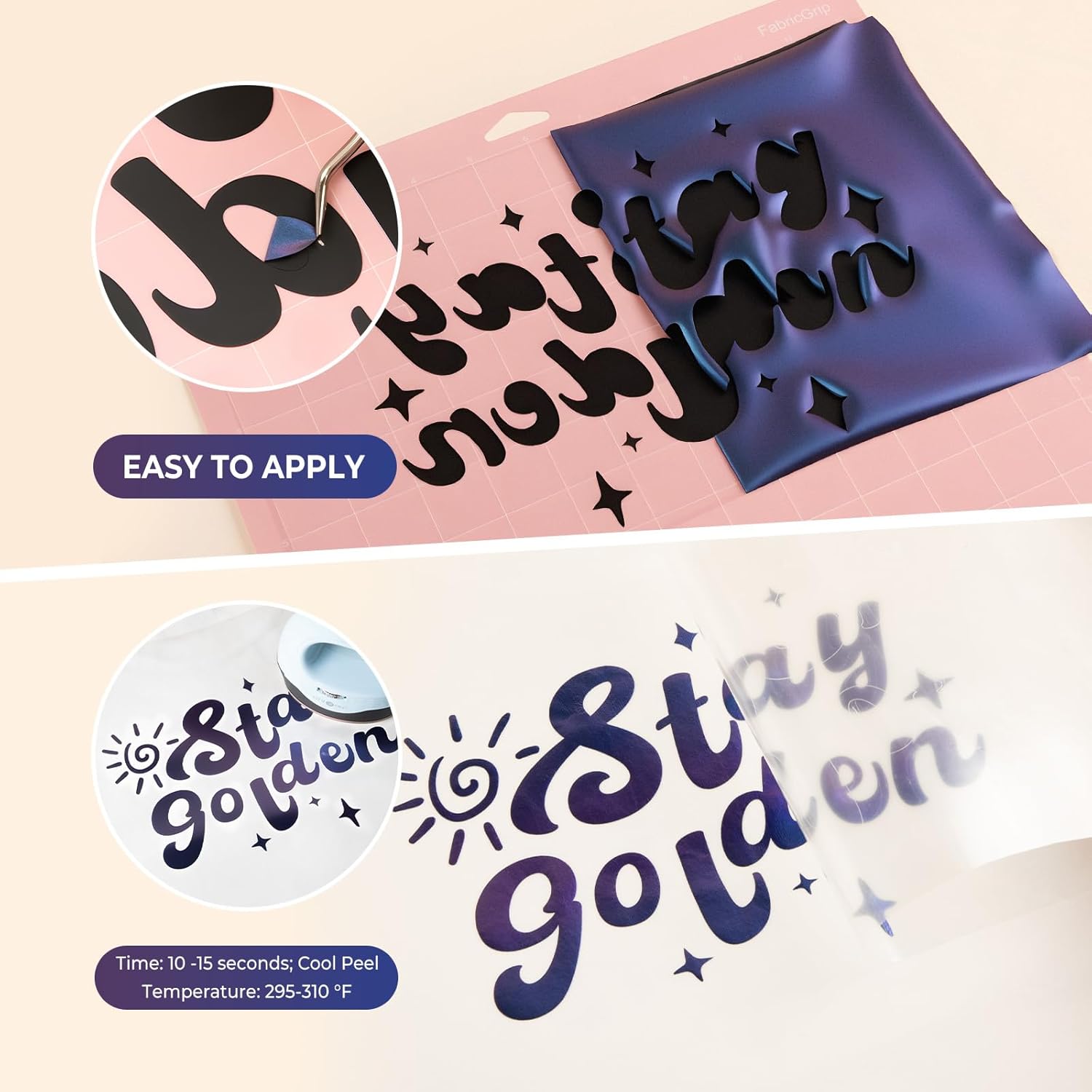 - 【Unique Effect】 Our Chameleon HTV vinyl measures 12" x 8FT and features a soft texture with a unique chameleon effect that changes color at different angles. The gradient effect, from Purple to Royal Blue, makes your garments stand out and exudes a premium feel. The iron-on film is temperature- and pressure-sensitive, allowing for easy heat transfer to any T-shirt, bringing your creativity to life!