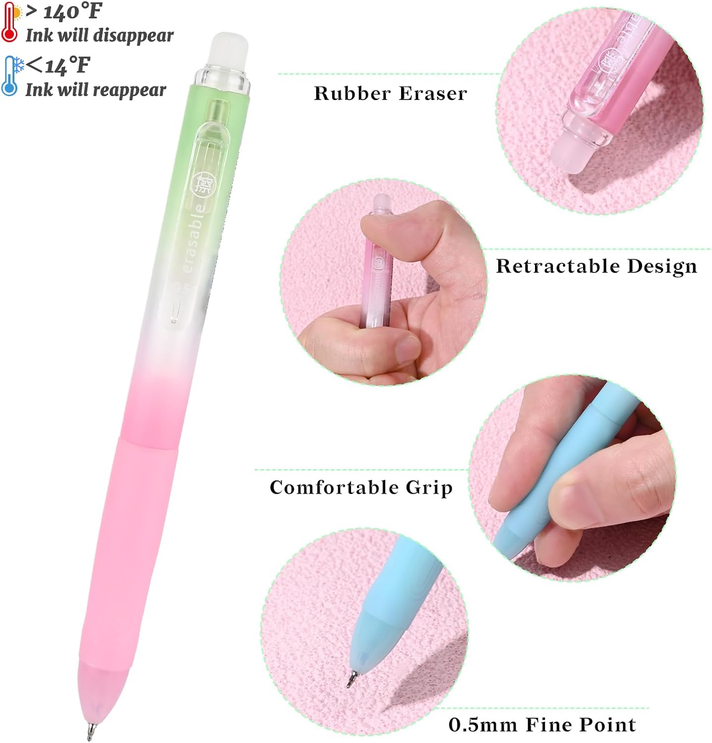 - Smooth Writing High Quality Ink: This 0.5mm fine point erasable ink pen uses high-quality ink, ensuring smooth writing without jamming or bleeding. The eraser on top make mistakes disappear easily