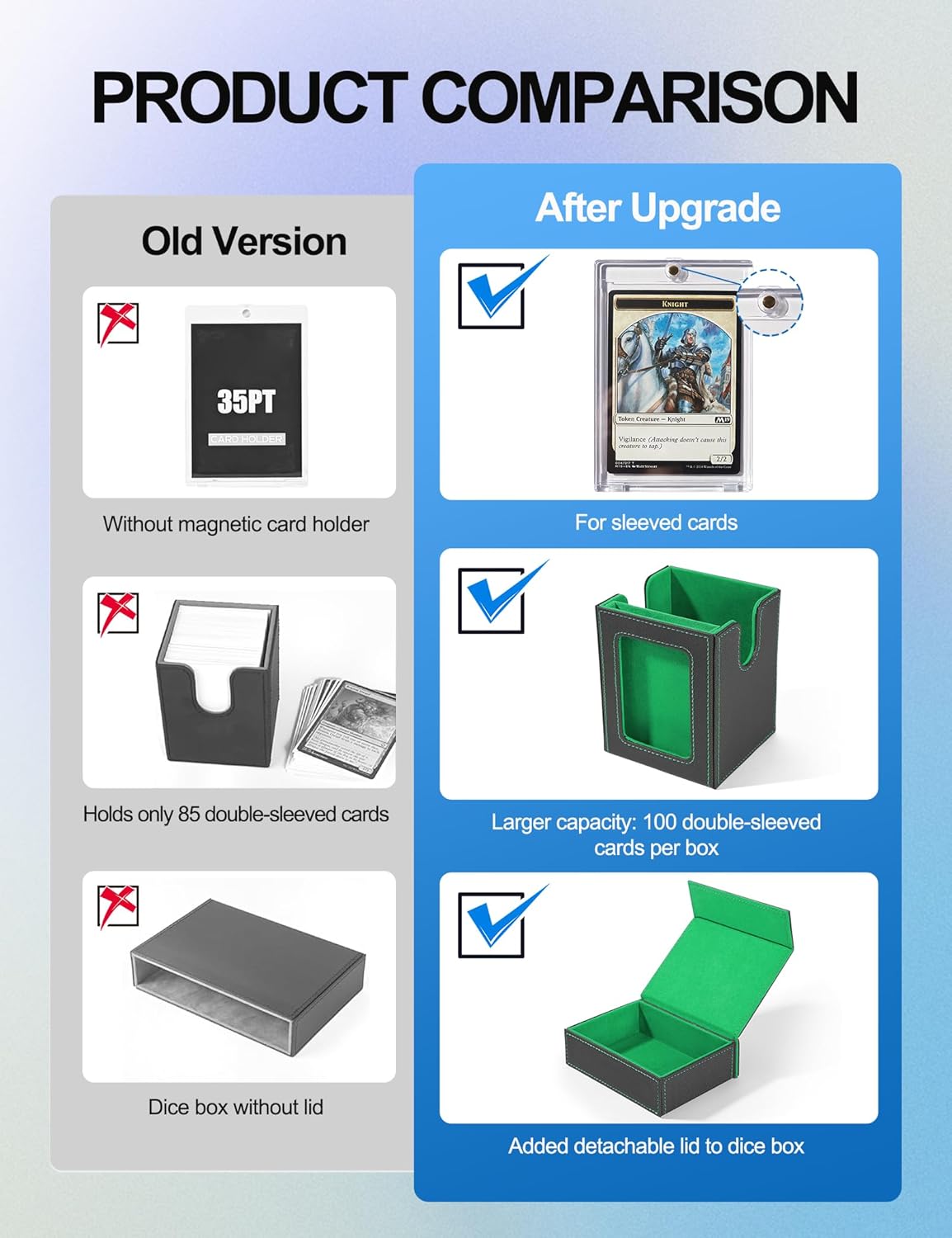 - 【Unique Design】This deck box is designed as a combo pack, each deck box comes with a display window, which can clearly show your favorite Commander decks; each deck box is ready for complete disassembly, so that you can place your deck box and dice box anywhere you want; at the same time the vacant cover can be used as a game mat, which makes it easy for us to use it in our daily life.
