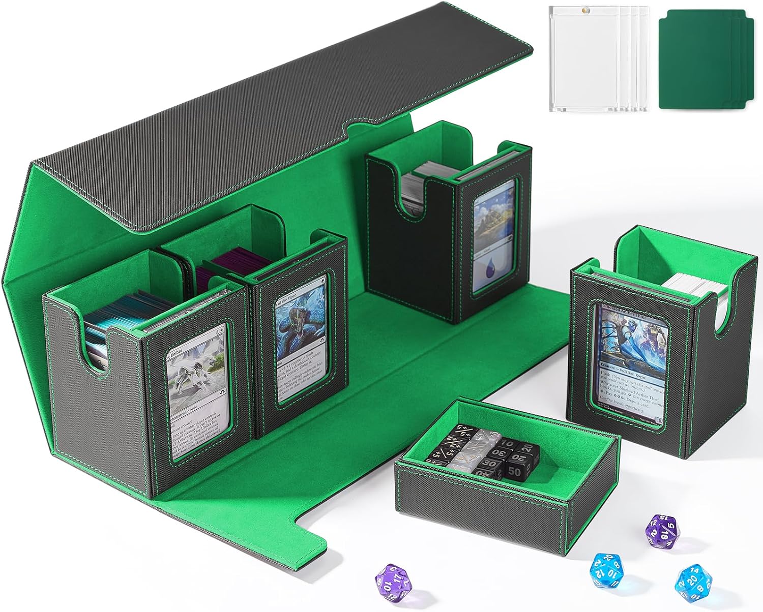 Card Deck Box for MTG with Commander Display, 5 in 1 Card Deck Case Holds 800+ Unsleeved Cards, Strong Magnet Organizer Compatible with Yugioh TCG Sports Cards (Black&Green)