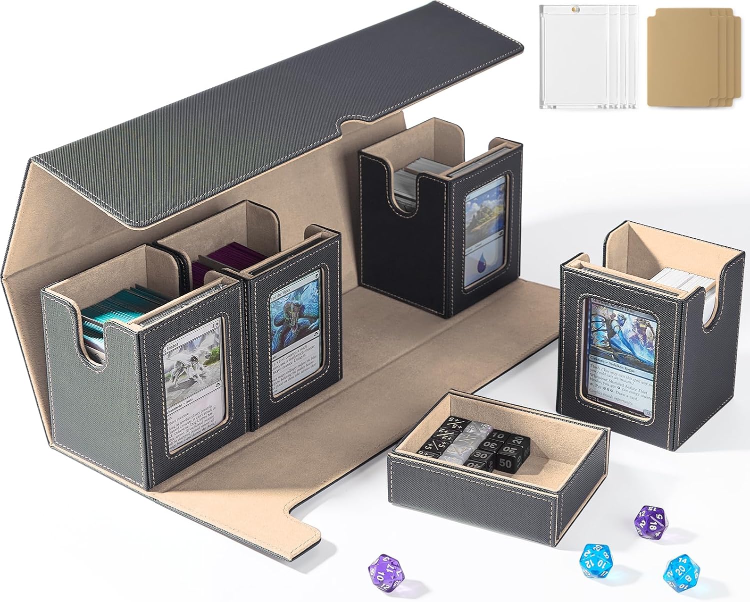 - 【5-in-1 Multi-Functional Card Deck Box】This magic card box includes 4 individual deck boxes with display windows, paired with 1 dice tray, it can hold 4 sets of 100 double-sleeved cards or 4 sets of 130 single-sleeved cards or 4 sets of 230 unsleeved cards. The dice tray is also suitable for storing dice, coins, and counters, with practical and non-redundant functions.