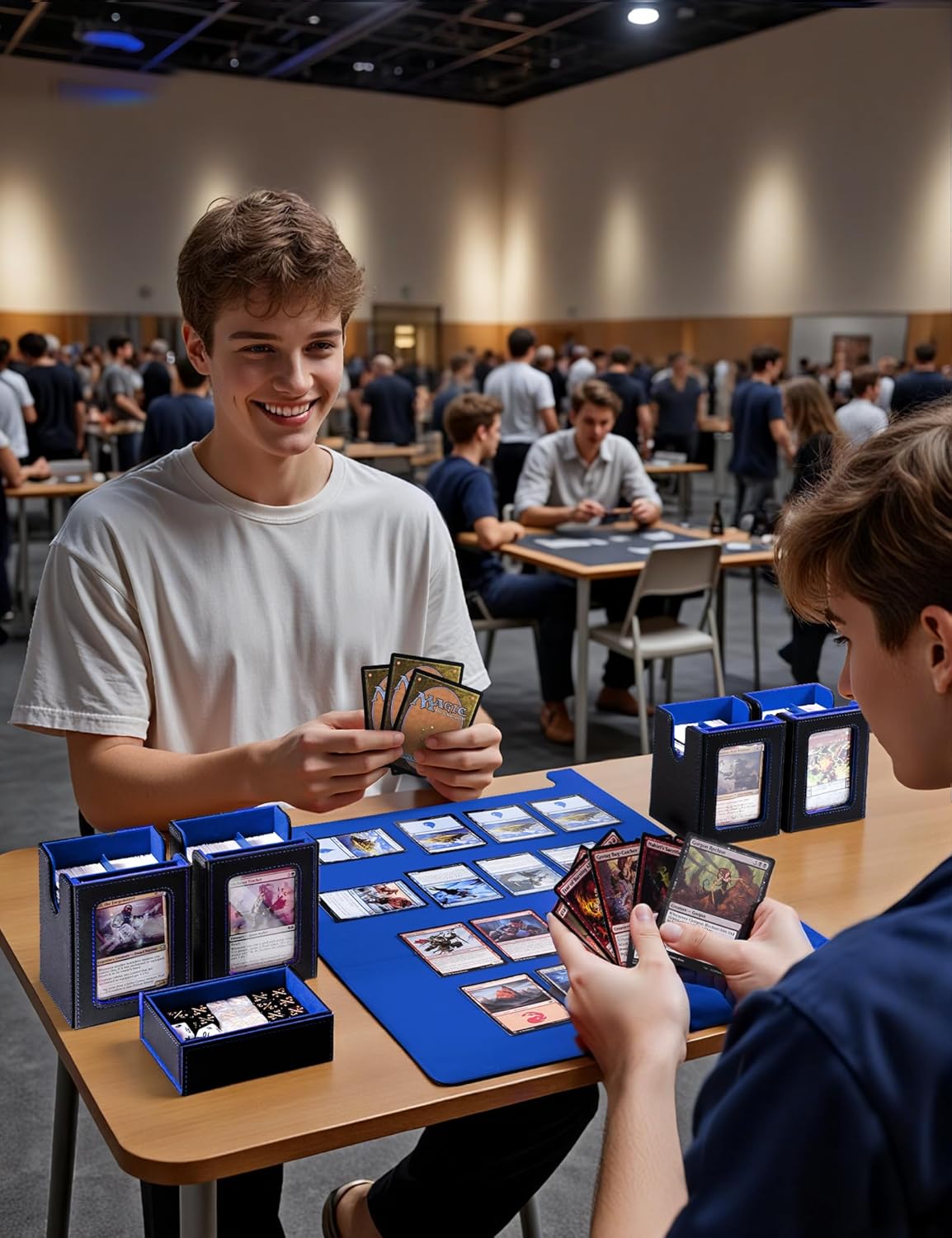 Card Deck Box for MTG with Commander Display, 5 in 1 Card Deck Case Holds 800+ Unsleeved Cards, Strong Magnet Organizer Compatible with Yugioh TCG Sports Cards (Black&Blue)
