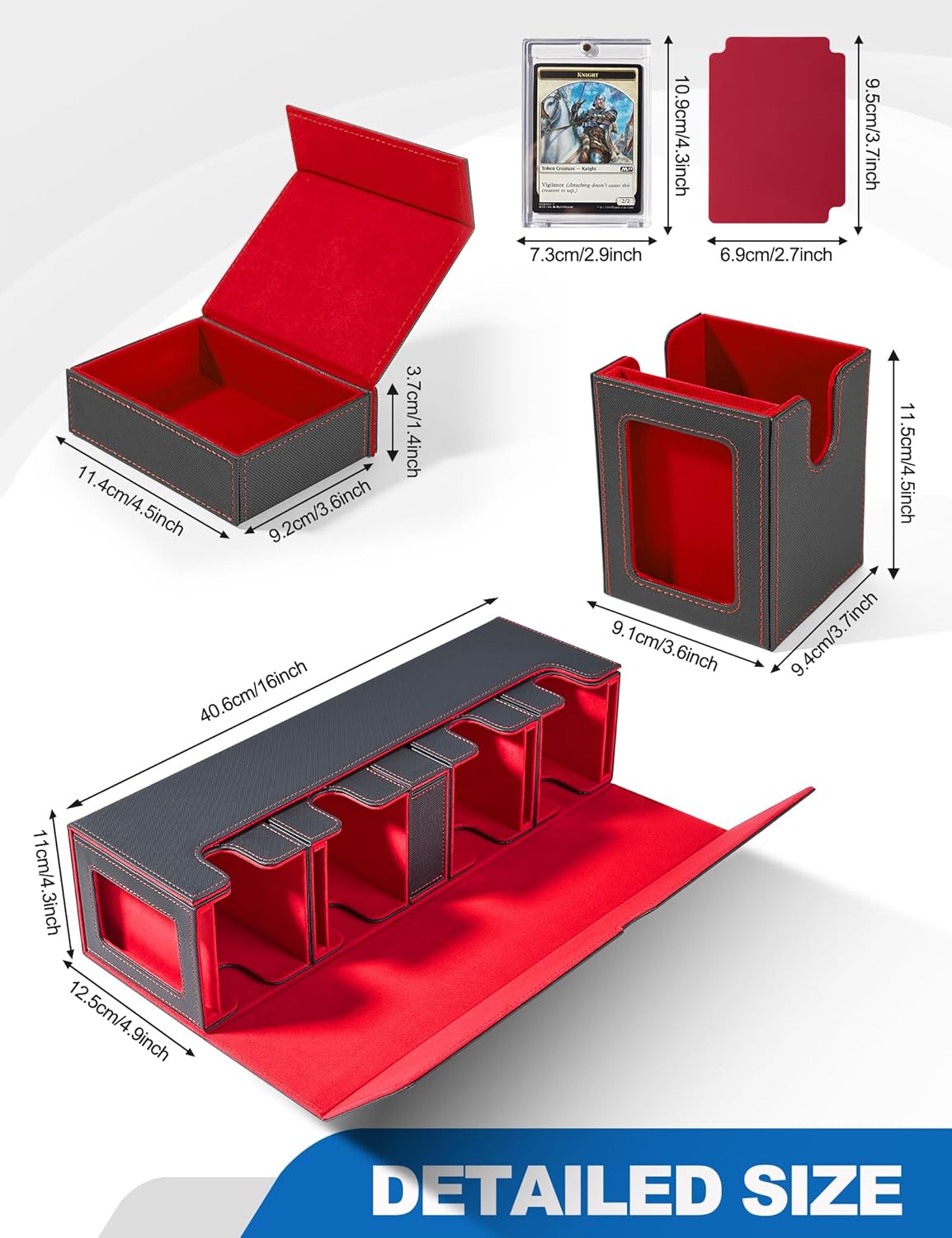 - 【Unique Design】This deck box is designed as a combo pack, each deck box comes with a display window, which can clearly show your favorite Commander decks; each deck box is ready for complete disassembly, so that you can place your deck box and dice box anywhere you want; at the same time the vacant cover can be used as a game mat, which makes it easy for us to use it in our daily life.