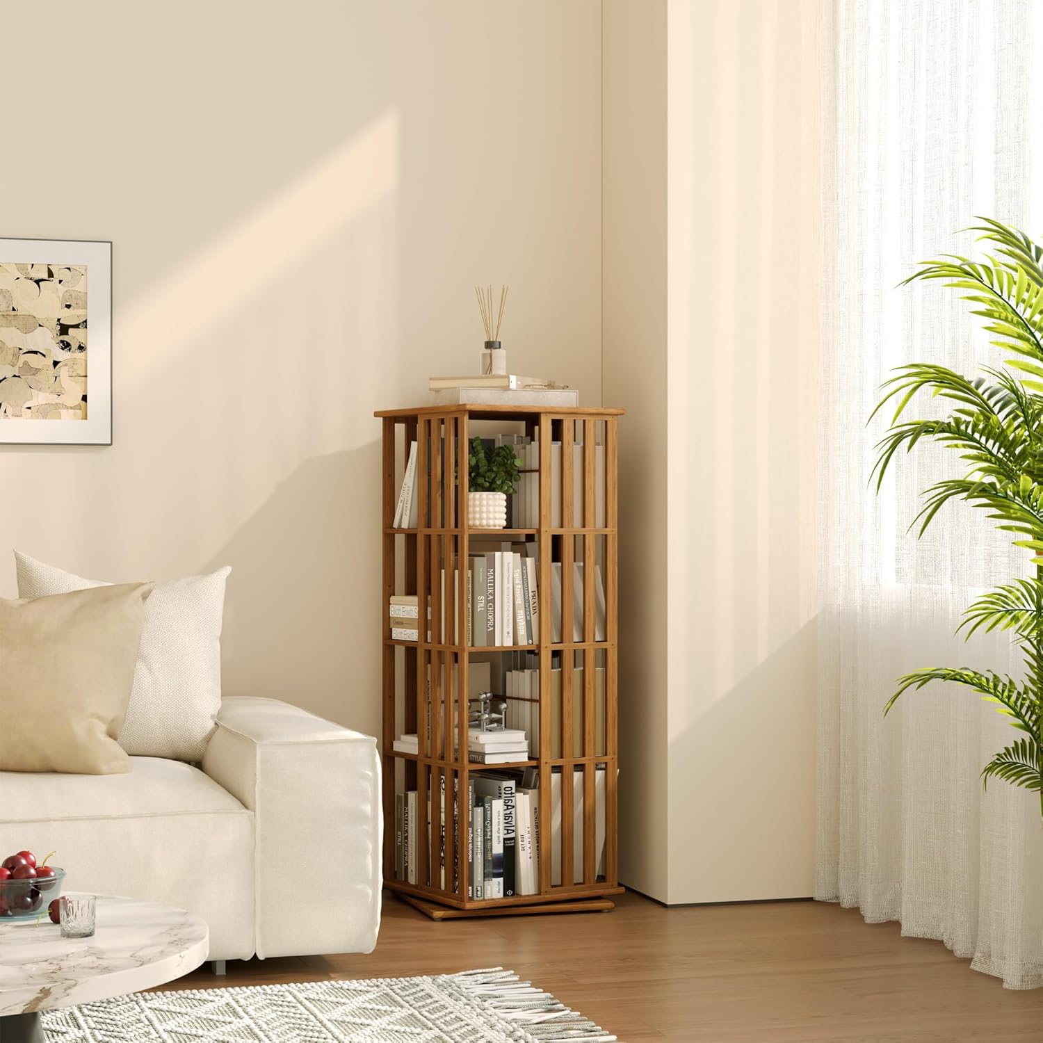 - 360° Rotating Bookshelf with Stable Base: Enjoy effortless organization with this rotating bookshelf towerâsmooth 360° spin lets you find books, movies, or dĂ©cor in seconds without bending or rearranging. The sturdy bamboo base and reinforced structure keep your spinning bookcase stable and wobble-free, even when fully loaded. Ideal for living rooms, bedrooms, home offices, or small apartments.