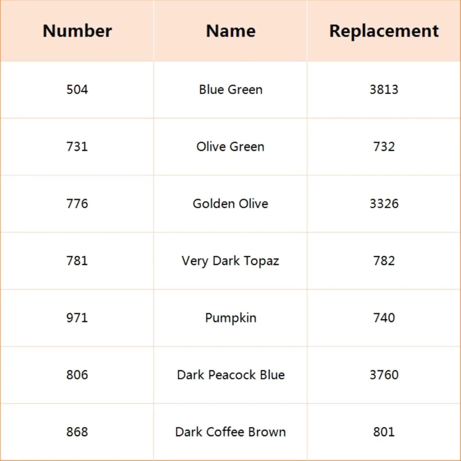 - Warm Tips: The Number 504 is replaced by 3813, 731 is replaced by 732, 776 is replaced by 3326, 781 is replaced by 782, 971 is replaced by 740, 806 is replaced by 3760 , 868 is replaced by 801.