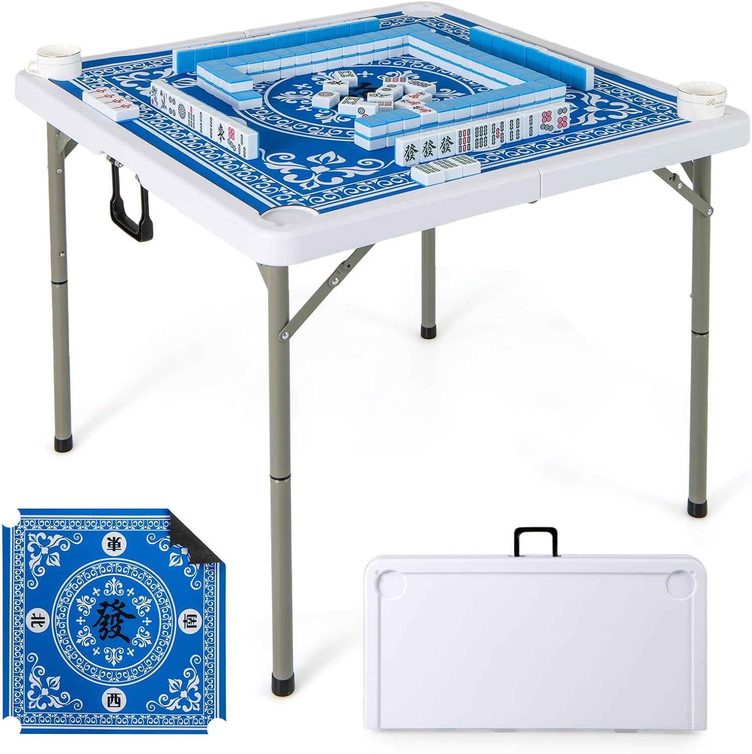 Giantex Folding Mahjong Table, 35" Square Card Table with Cup Holders, Removable Noise Reduction Mat, HDPE Tabletop, 4-Player Portable Domino Tables for Poker Blackjack Board Game (Blue)