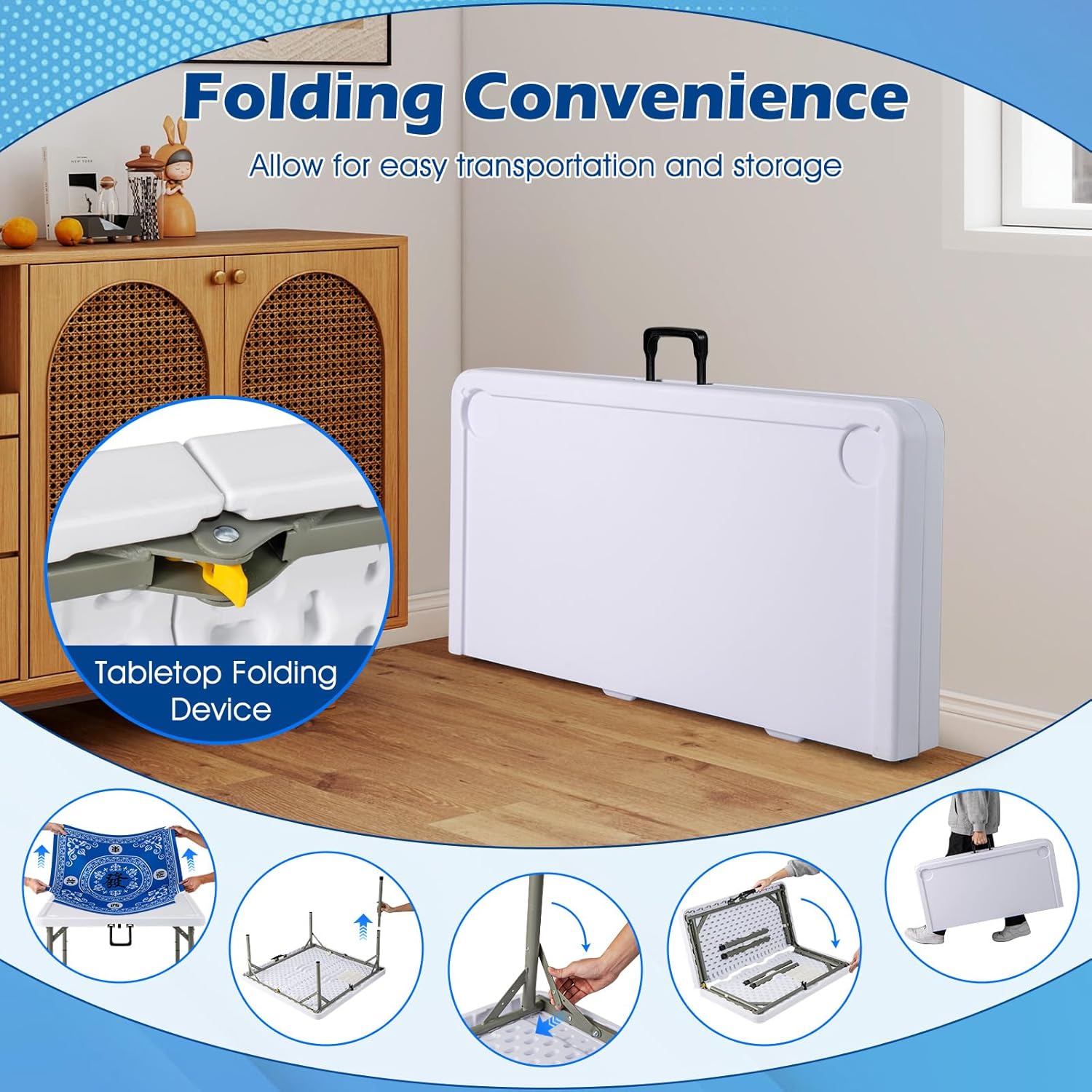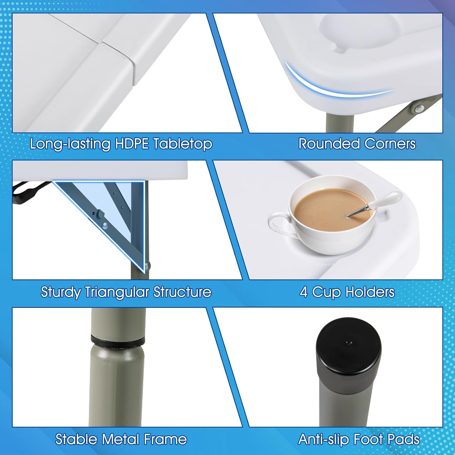 - Sturdy Construction: Built from HDPE, this card table is not only strong and impact-resistant, but also lightweight, waterproof, and easy to clean. Supported by a sturdy metal frame with a reinforced triangular structure, it can hold up to 180 lbs. Anti-slip foot pads ensure it stays steady on any surface.
