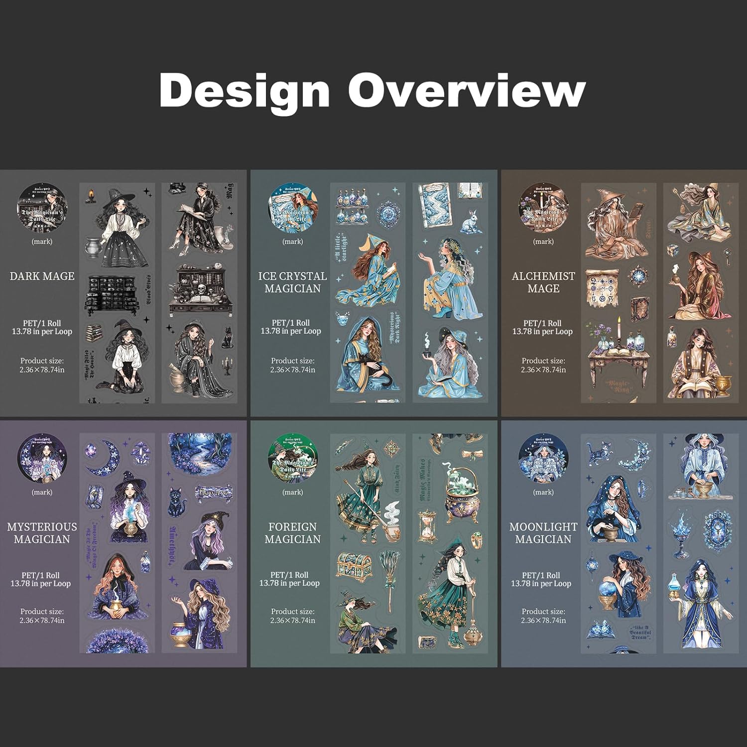Magic-Themed PET Sticker Tape Set – 6 Rolls Pre-Cut Fantasy Witch Designs, Adhesive, with Clip for Scrapbook, Journal and DIY Decoration