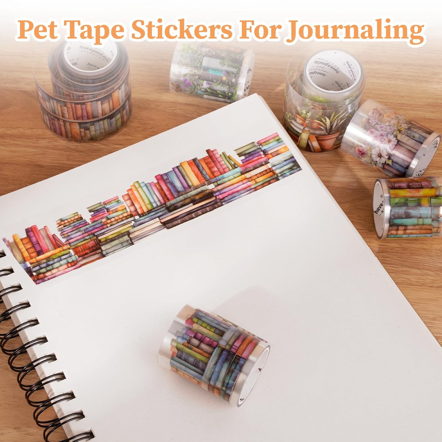 - Six artistic designs for a stylish touch: These pet tape stickers for journaling come in bookshelf, nature, and floral themes. These fresh, artistic designs instantly elevate diaries and scrapbooks, adding a touch of elegance and aesthetic appeal. Perfect for creating unique handmade designs, these pet tape are more aesthetically pleasing than regular tapes