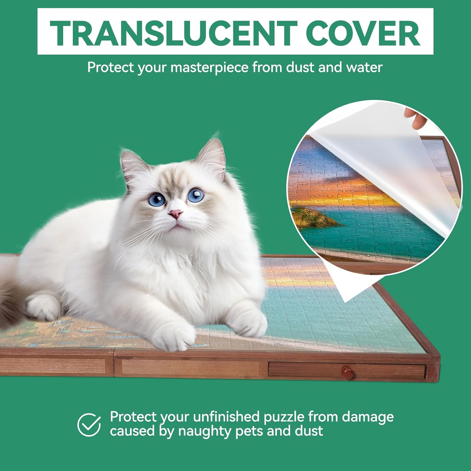 - 【Included Protective Cover and Easy to Store】 The mat protects your puzzle from dust and curious pets, ensuring your puzzle remains undisturbed and protected between sessions, making your puzzling experience more enjoyable and organized.The rotating puzzle board is designed for easy storage and transport, allowing you to quickly move and stow your puzzle away.Simply cover your puzzle, close the drawers, and slide the board under the sofa or bed.
