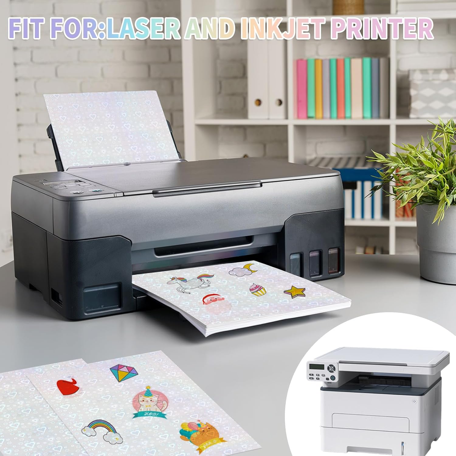 - Holographic Design: This package includes 20 clear, 8.5x11-inch sticker sheets for inkjet printers. The holographic design allows for colors to change depending on the angle and lighting.