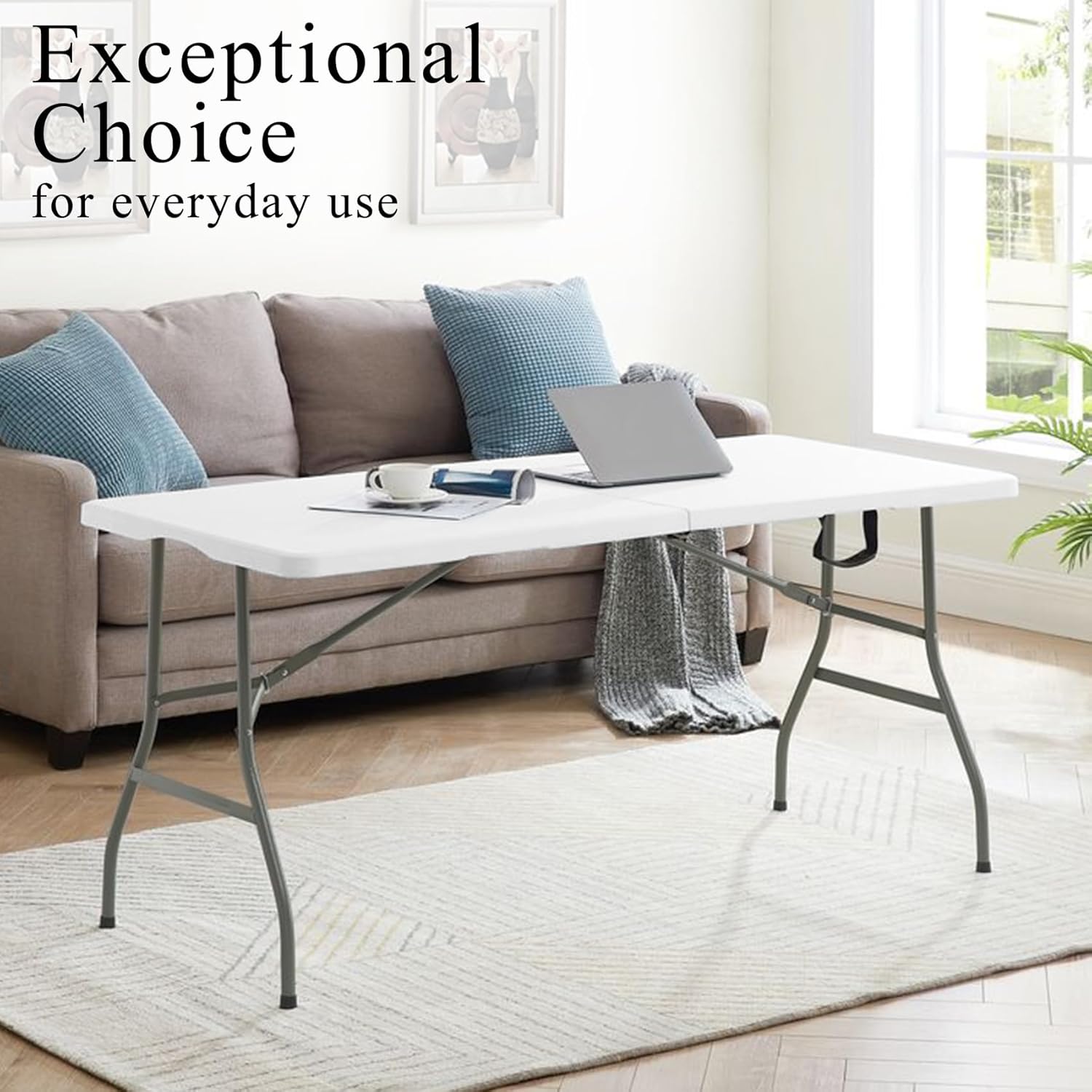 - FOLDABLE AND AND PORTABLE: It can be folded to half its size and stored in a closet when not in use, conserving space in the room. It is easy to close, and features a convenient handle for carrying once it's folded. Designed for stability, the event table features secure locking mechanisms and non-slip feet to prevent shifting or tipping during use. The carrying handle facilitates effortless single-person transport.