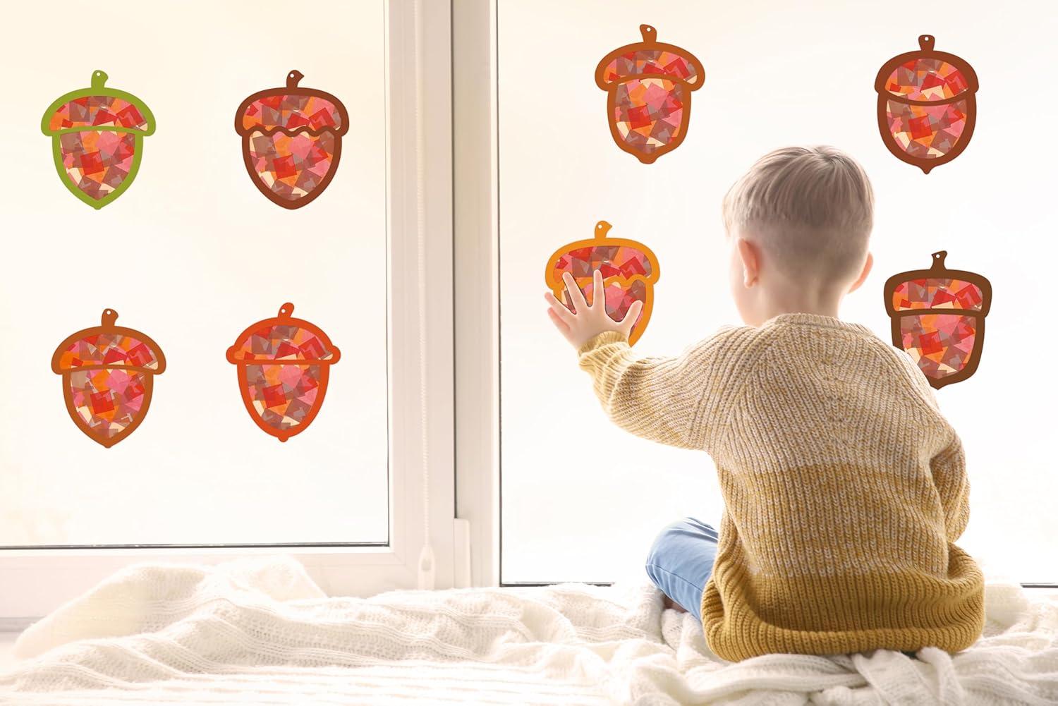 Renbuzhu 40PCS Fall Crafts Bulk: Acorn Paper Suncatchers DIY Kit for Autumn Thanksgiving Activities Decorations, Window Stained Glass Effect Art Supplies