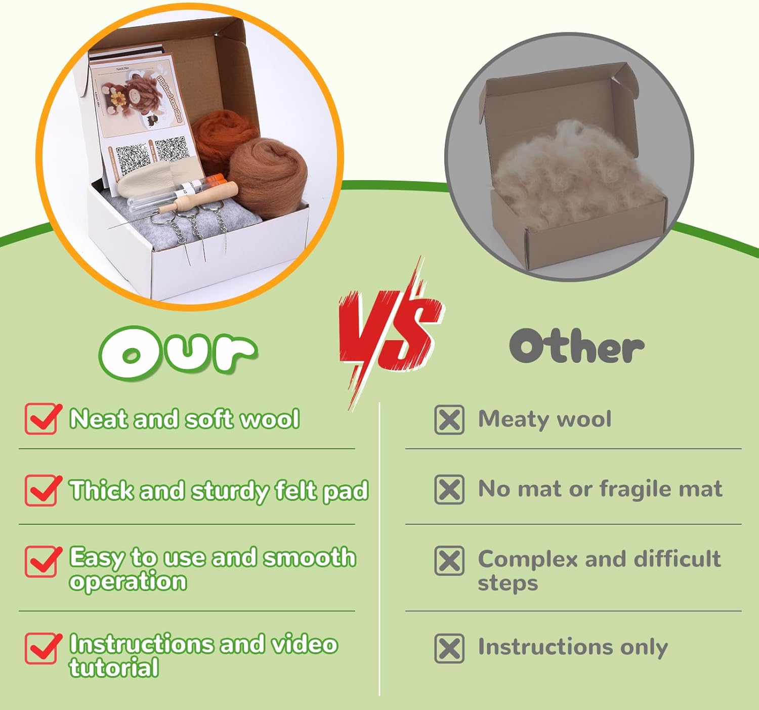 - Wool Felting Starter Kit: The wool felting set includes the amount of wool needed for the projects, a needle felting pad, instructions, finger cots, and a wooden felt handle. We also offer 2 models of felting needles to meet your felting needle need