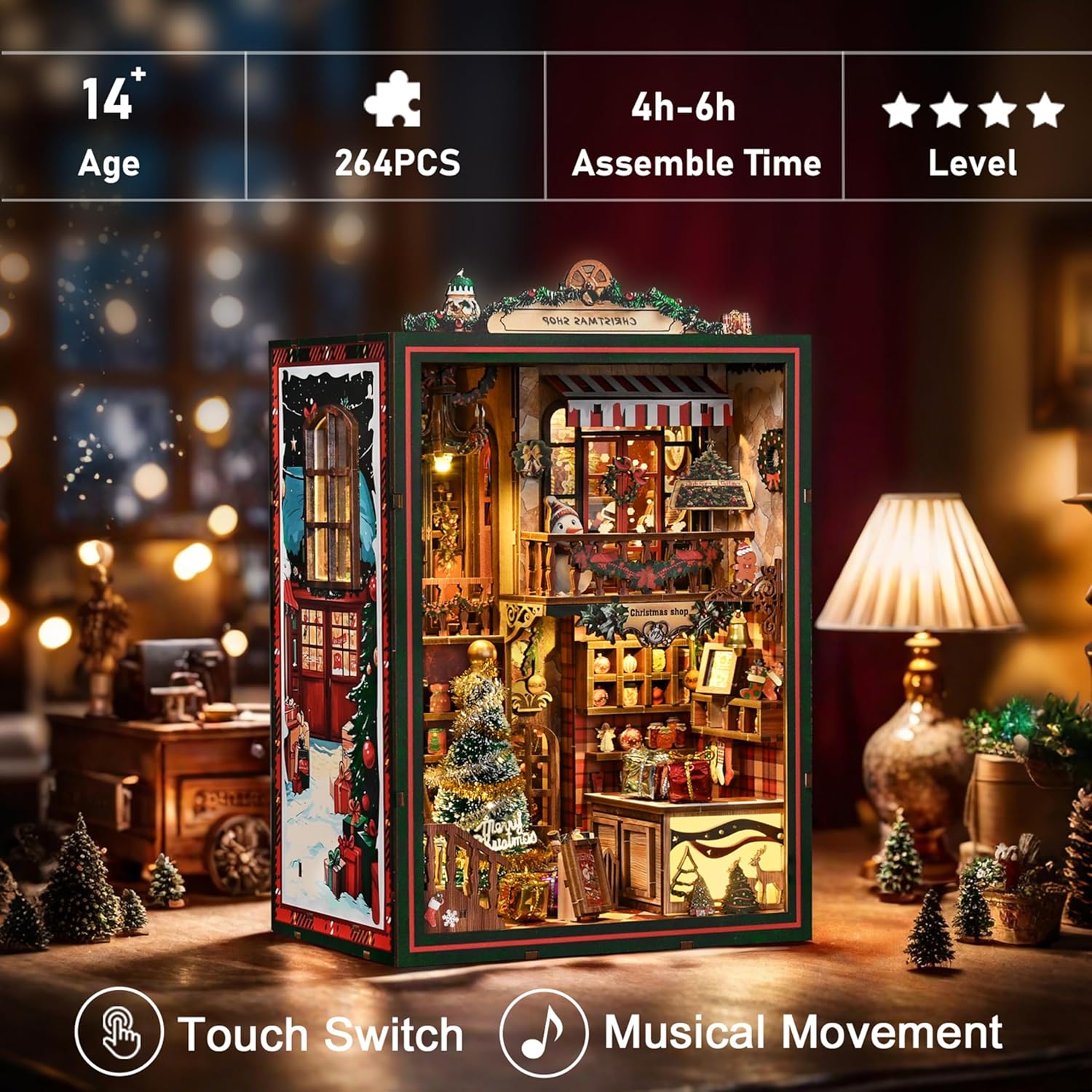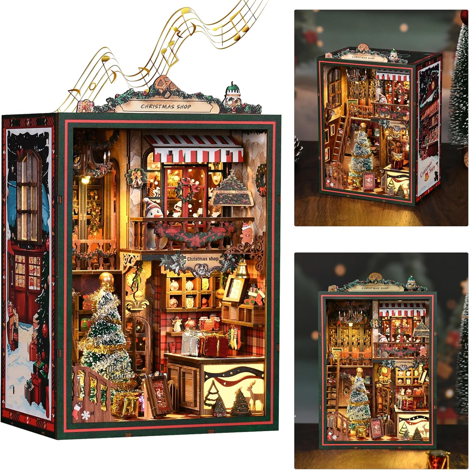 - 【Christmas Shop Book Nook Kit】Ding! Here comes the Christmas gifts. This Christmas shop theme book nook features many intricate and delicate decorations, such as snowman, Christmas tree, bell, Christmas sock, Christmas gifts and so on. This Miniature house kit with music mechanism, when play music "jingle bells" and the lights on, the Christmas party begin