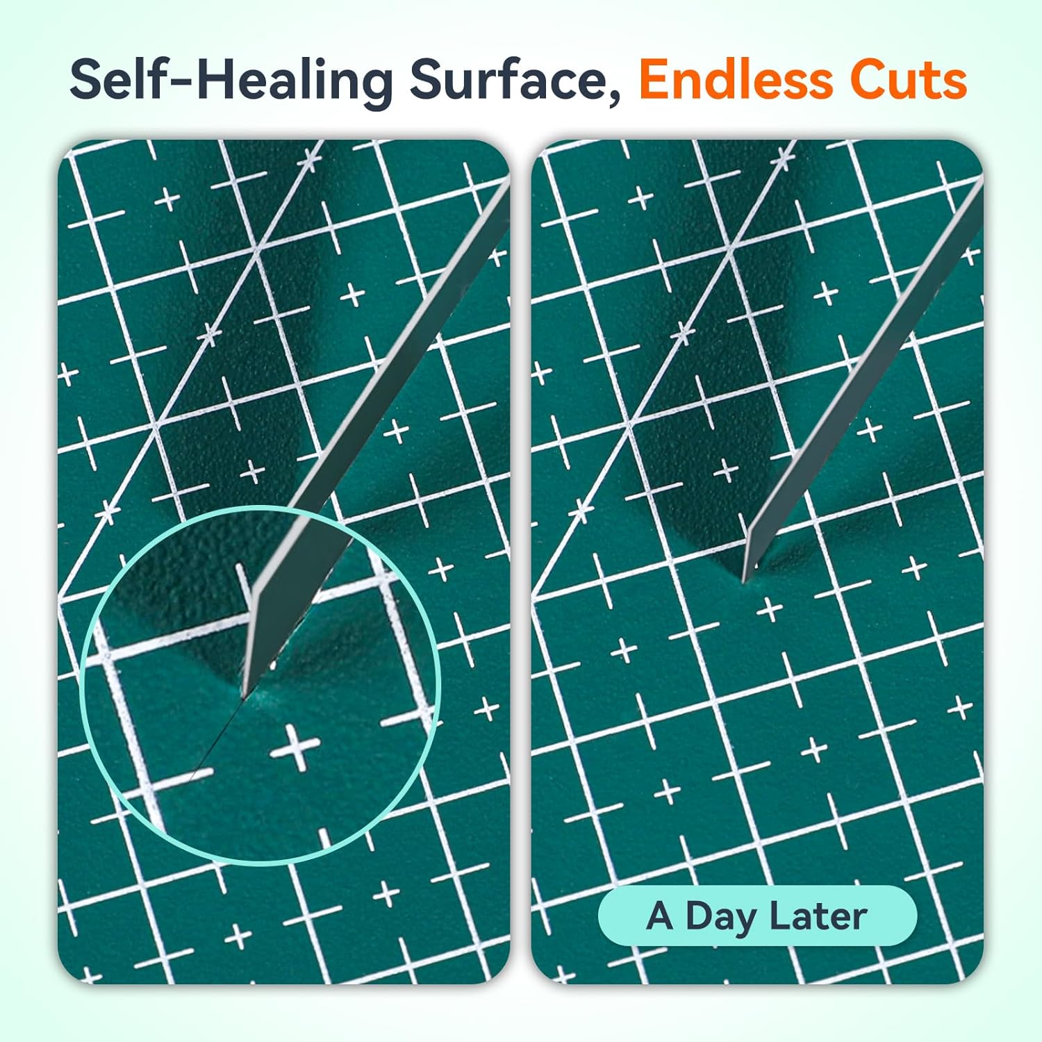 - SELF-HEALING AND DURABLE: Crafted from 5 layers of upgraded high-density material, the self healing cutting mat features a soft PVC surface that protects your blades and a rigid white core that resists cuts. This construction allows the surface to self-repair after use, making it perfect for all your heavy-duty cutting needs and ensuring long-lasting performance