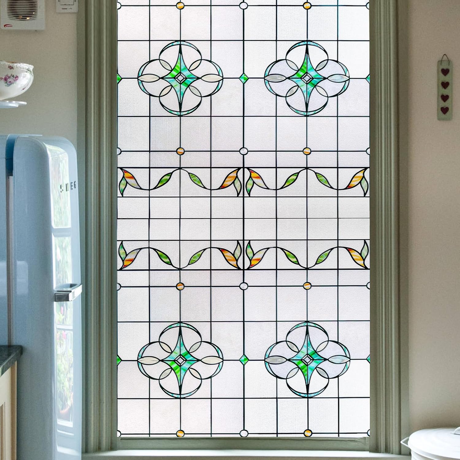 - Easy to Install and Window Friendly-Installation is a breeze with our Static Cling Decorative Stained Glass Film, which requires no adhesive. It is reusable and repositionable without damaging your windows and comes with a spray bottle and squeegee for your convenience.