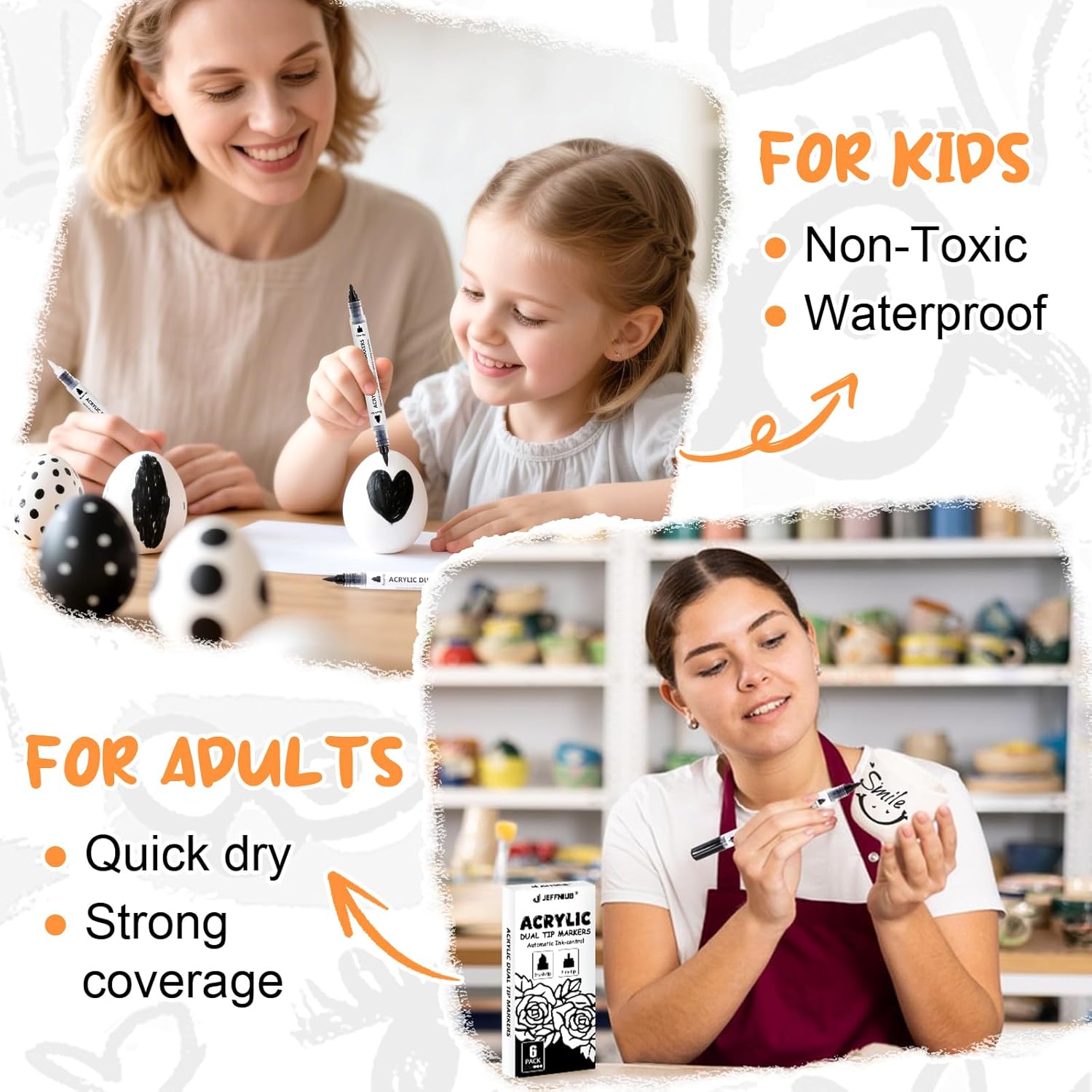 Black White Acrylic Paint Pen Brush, 6PCS Dual Tip Automatic Ink-control Acrylic Markers for Rocks, Metal, Glass, Wood, Fabric, Porcelain, Ceramic