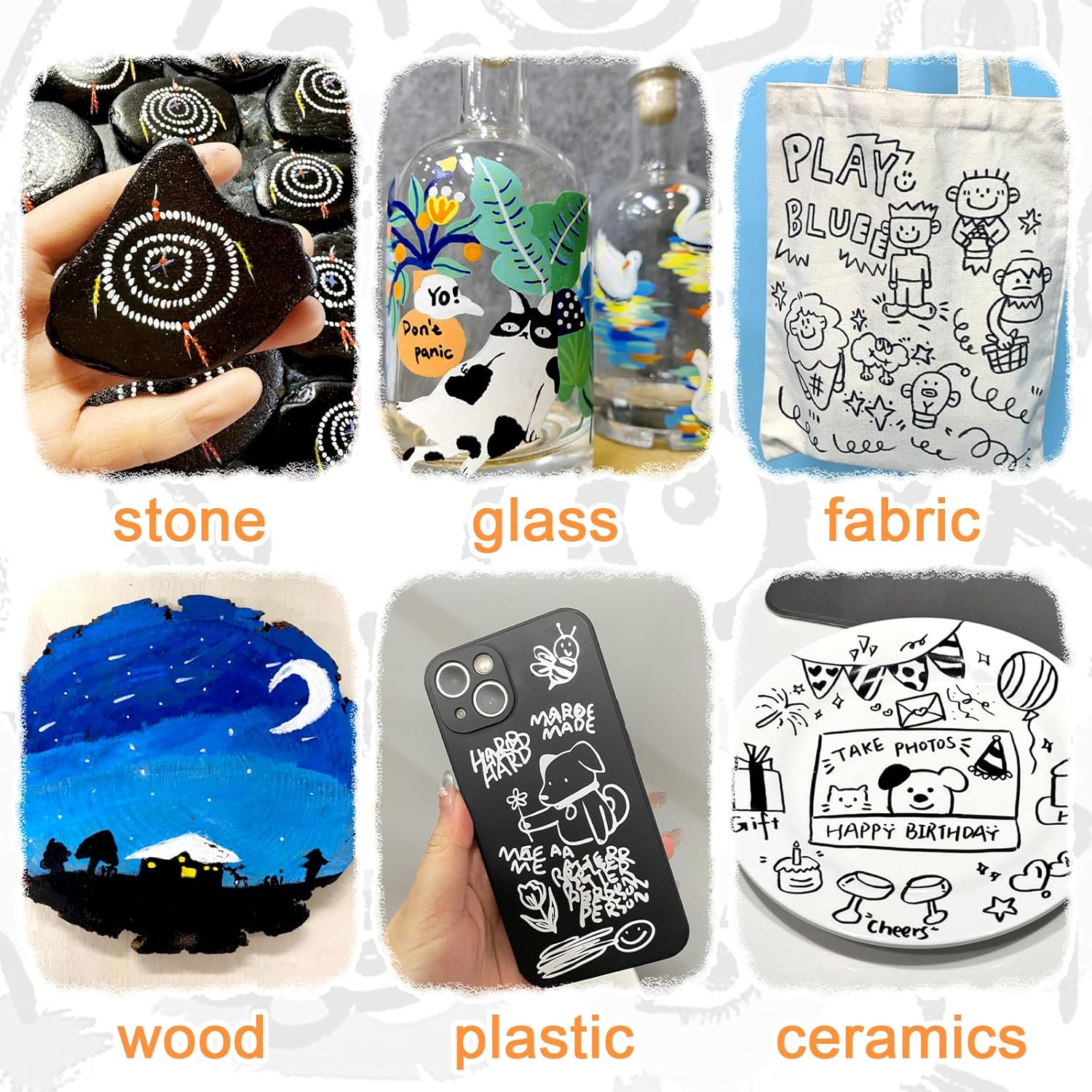 - Multi-Surface Use: The 2 classic colors (Black/White) make them perfect for most projects. High-quality acrylic paint marker for stones, wood, canvas, metal, leather, paper, unglazed pottery, and fabric. Delivers a durable, opaque, and glossy finish on both light and dark surfaces.