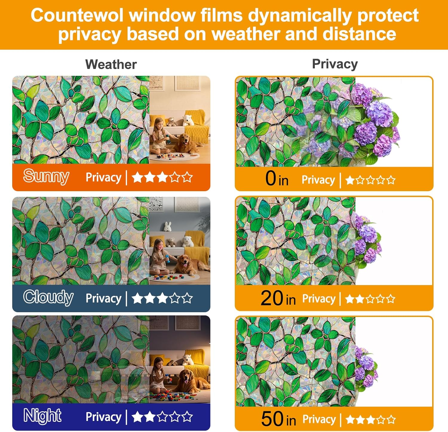 - DECORATIVE DESIGN: These window films feature a beautiful green leaf pattern that adds a natural freshness to any room and creates a rainbow visual effect when the sun shines.