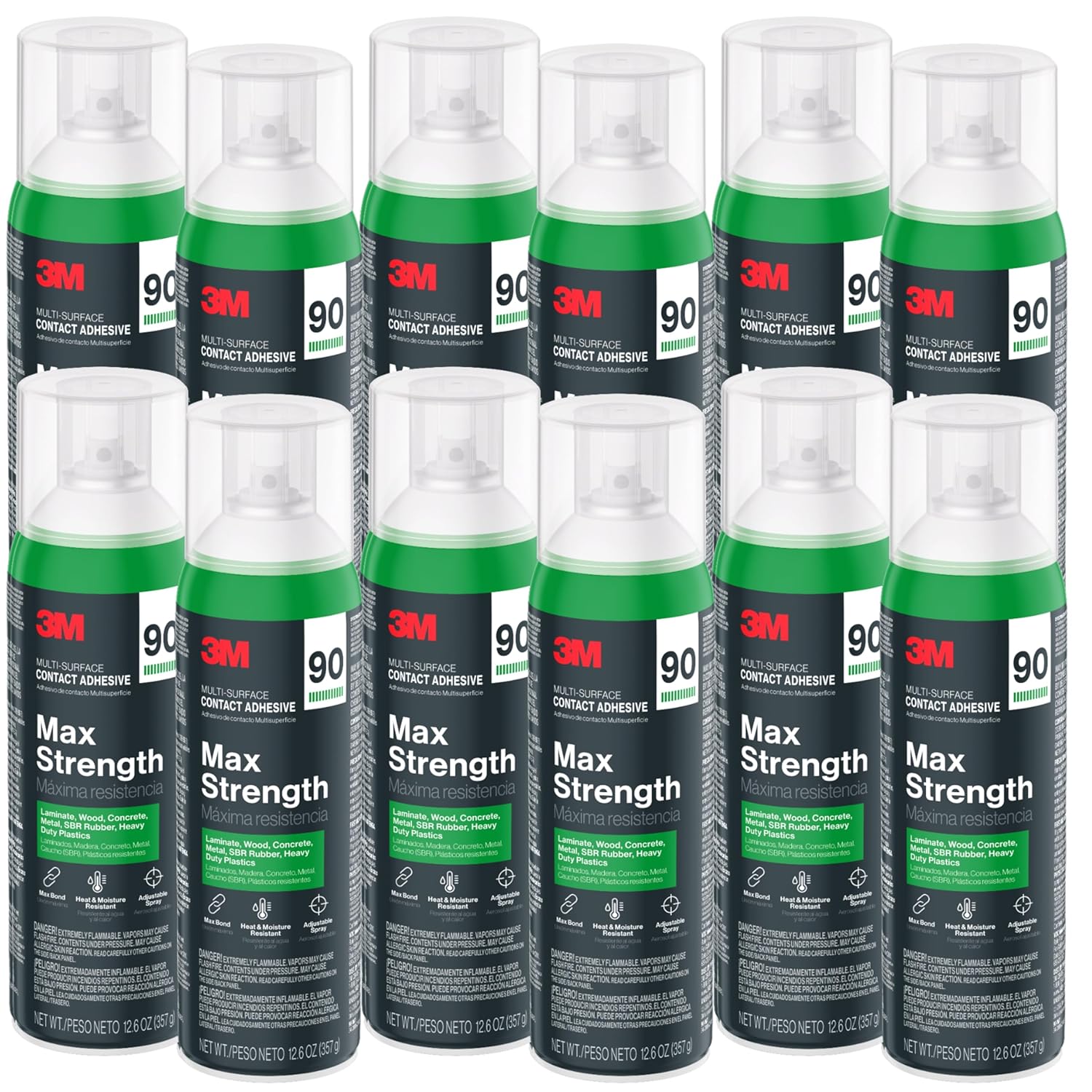3M Max Strength 90 Contact Adhesive Spray, 12.6 oz (Pack of 12) – Low VOC Heavy Duty Glue with Adjustable Nozzle, Heat & Water Resistant Bond for Metal, Wood, Plastic, Laminate, Concrete