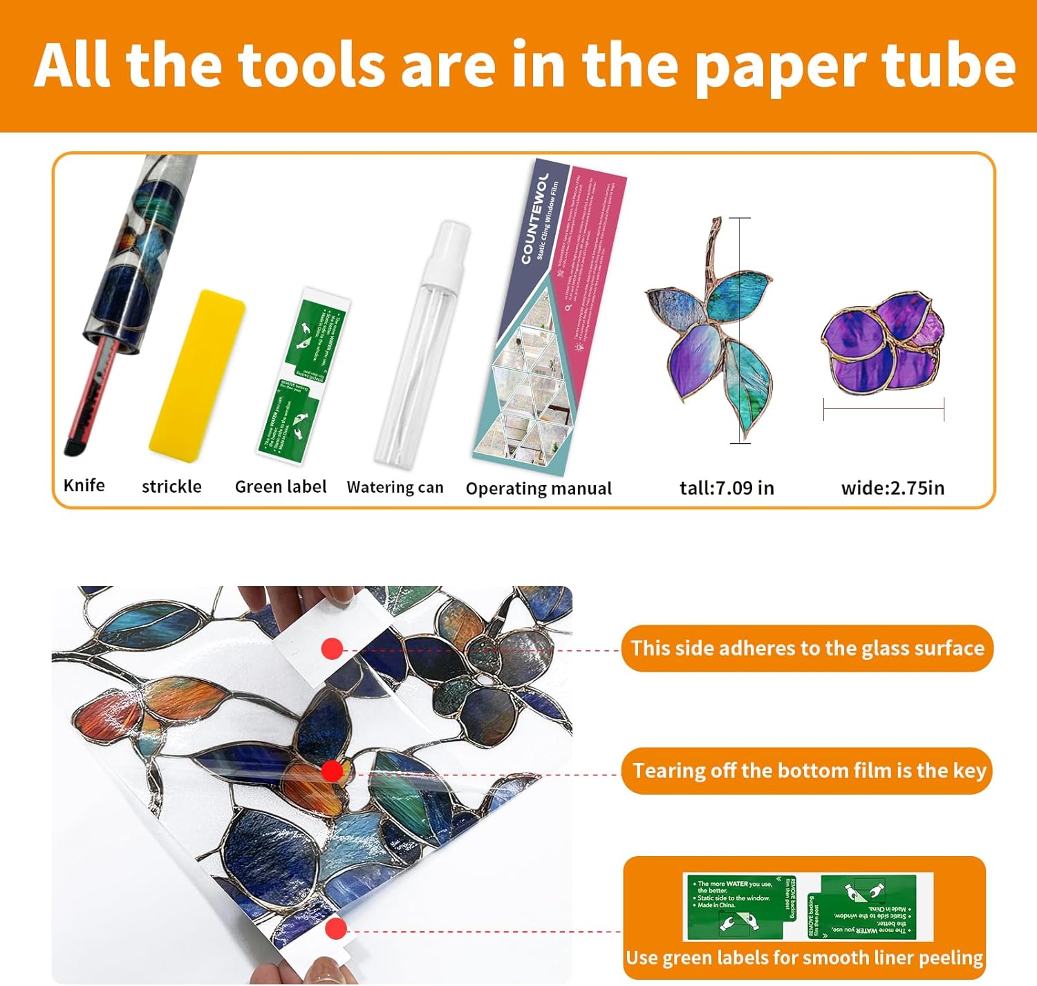 - EASY TO INSTALL: rainbow window film Tear and stick, equipped with a full set of tools, quick and easy to install.