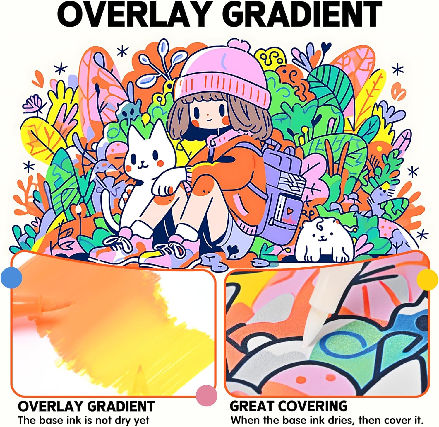 - 【Dual Tip Acrylic Paint Pens】Each acrylic marker come with a 1-5mm brush tip and a 1mm fine tip. Dual tip design meets different coloring needs. The fine tip is suitable for outlining, fine line work; The brush tip works well for large areas of coloring, detailing.