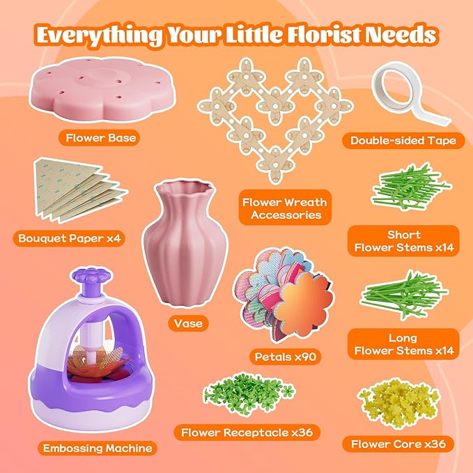 - 【Rich Accessories For More Fun】Comes with an easy-to-use embossing machine, colorful petals, flower centers, receptacles, long & short stems, sturdy base, and bouquet wrapping paper. With more pieces than standard sets, girls can build larger, more vibrant bouquets and freely explore endless floral combinations.