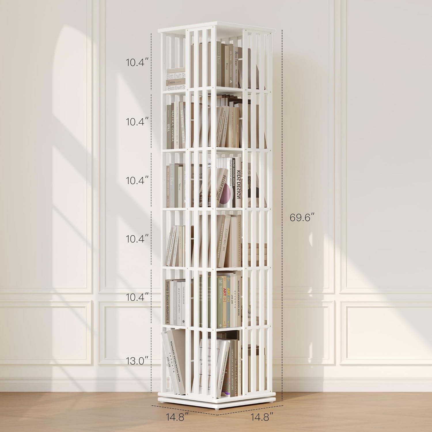 YOWOS Rotating Bookshelf Tower, 360 Display Spinning Bookcase, Bamboo Bookshelf Floor Standing Storage Rack, Wood Narrow Book Shelf Organizer for Kids&Adults (White, 6 Tier)