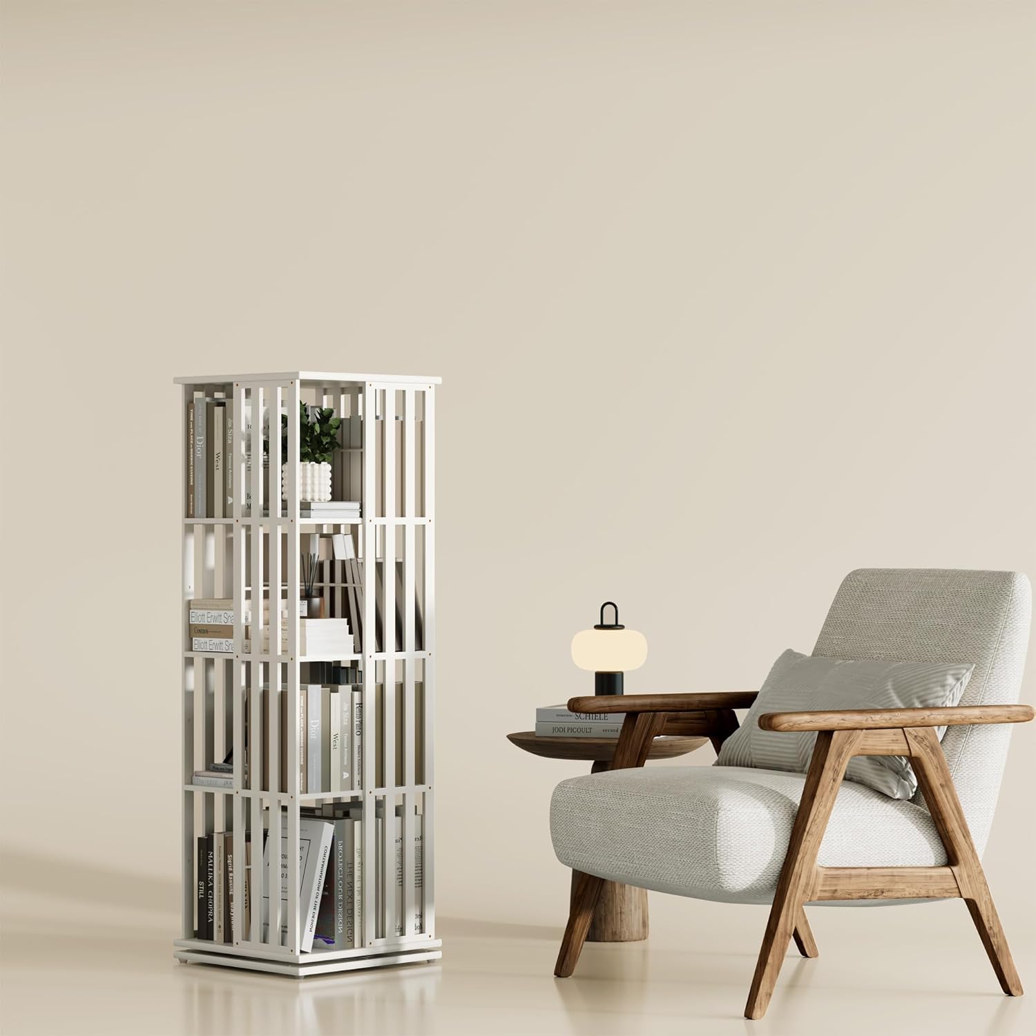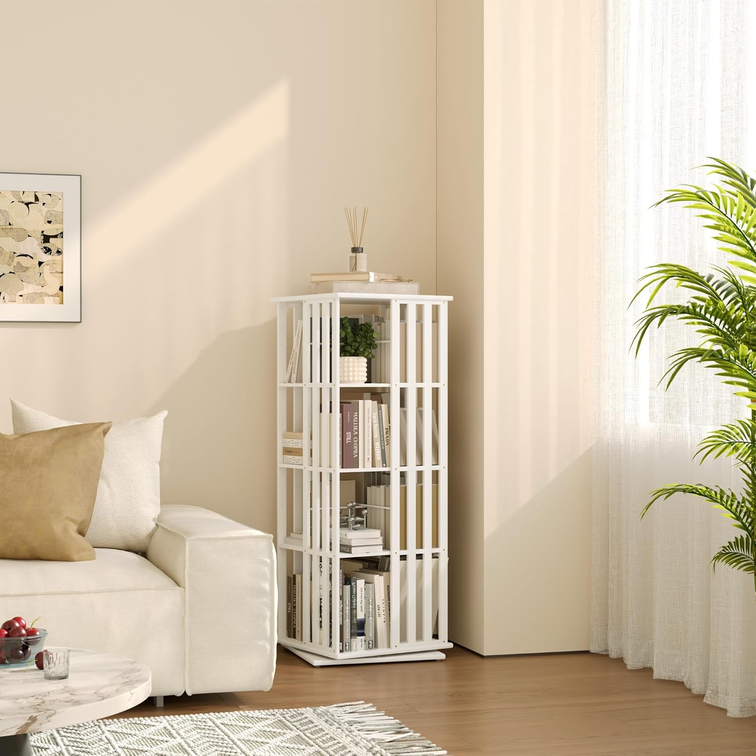 - 360° Rotating Bookshelf with Stable Base: Enjoy effortless organization with this rotating bookshelf towerâsmooth 360° spin lets you find books, movies, or dĂ©cor in seconds without bending or rearranging. The sturdy bamboo base and reinforced structure keep your spinning bookcase stable and wobble-free, even when fully loaded. Ideal for living rooms, bedrooms, home offices, or small apartments.
