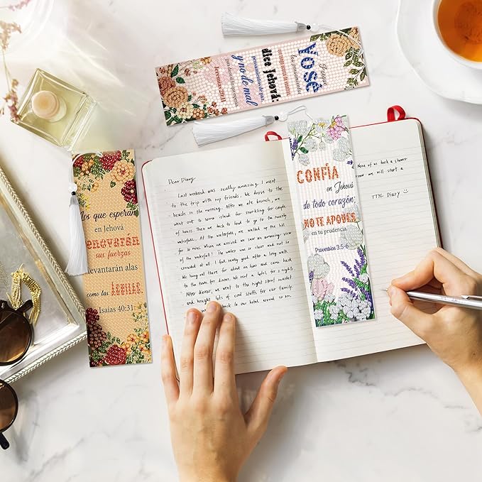 8 Pieces Christian Bible Verse Diamond Art Bookmarks 5d Christian Beaded Bookmark Acrylic Tassel Bookmark for DIY Making Beginners Kids Adults Arts Craft Supplies (Spanish)