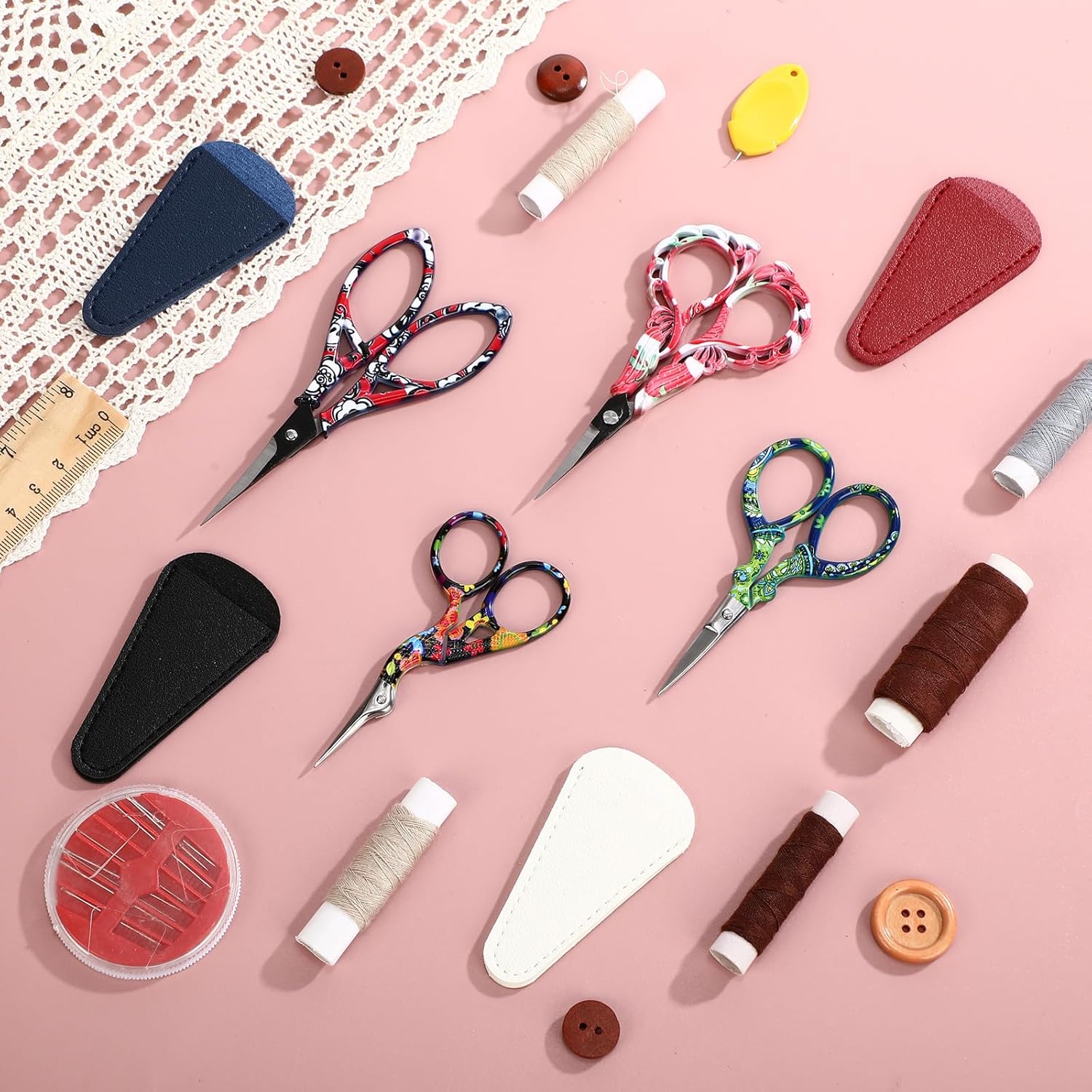 Zhehao 4 Pcs Sewing Embroidery Scissors with Artificial Leather Cover Sewing Stainless Vintage Embroidery Scissors for DIY Needlework Art Manual Handicraft (Delicate)