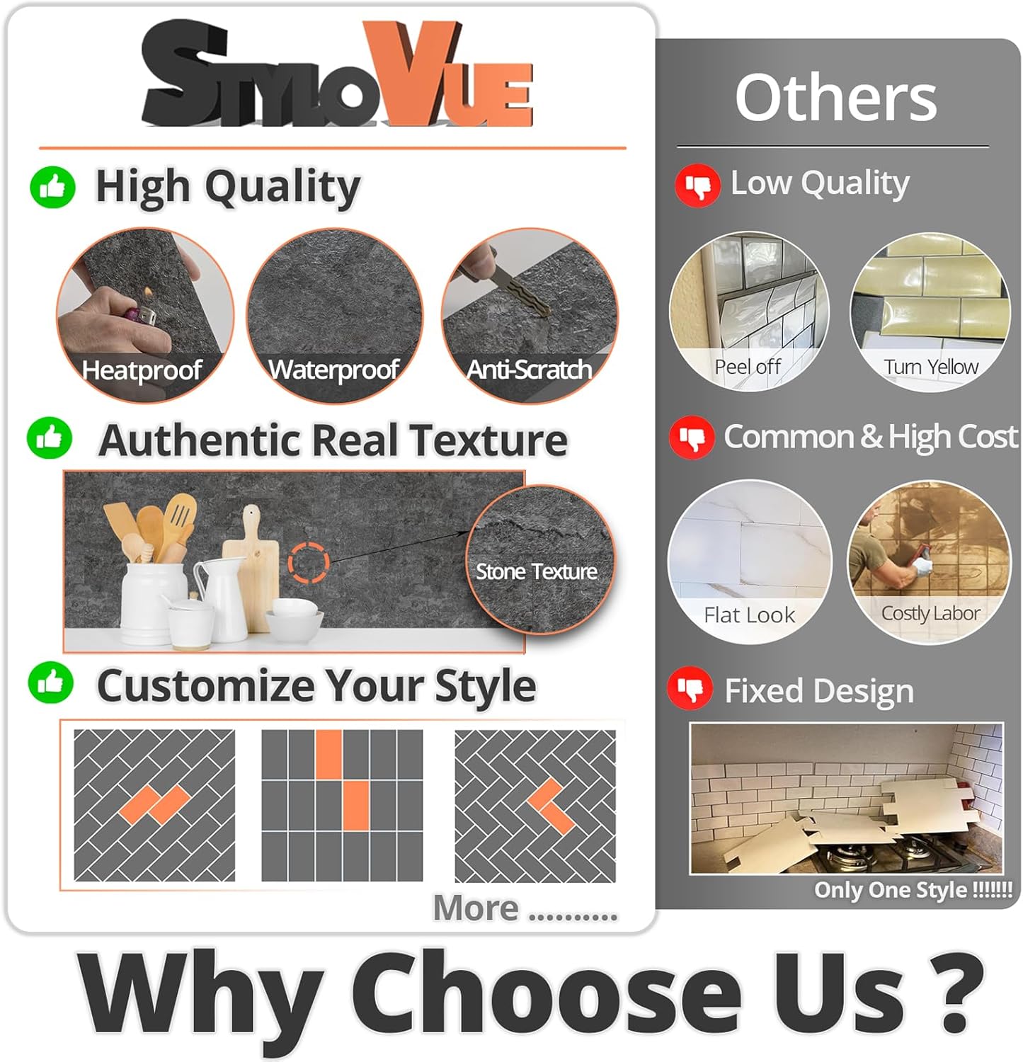 - šš„ššÆššš ššØš®š« šš©ššš: Featuring unique slot edges for a realistic grout-look, StyloVue self adhesive wall tiles offer an authentic design and texture that customers adore. Elevate the aesthetic of your space while simplifying maintenance and cleaning, without the hassle of traditional grouting.