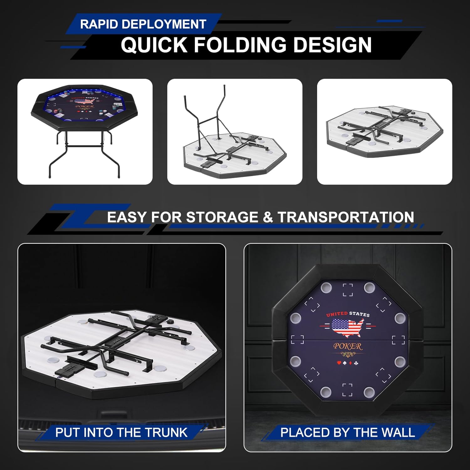LED Poker Table Foldable, Octagon Casino Leisure Gamimg Table for 8 Player, Folding Texas Holdem Blackjack Table w/Built-in LED Light, Padded Rails & Cup Holders for Home Game Room