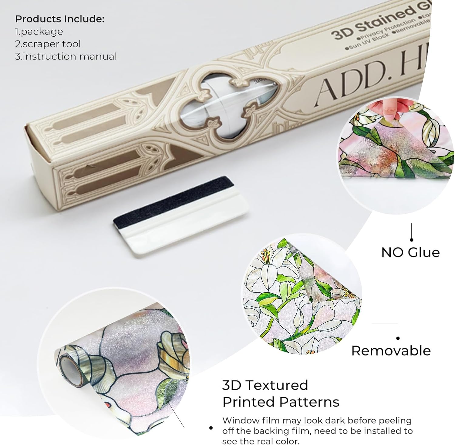 3D Stained Glass Window Film, Decorative Window Privacy Film for Bathroom, Front Door, Home, Sun Blocking Heat Control, Static Cling,White Lily 35.4inch x 78.7inch