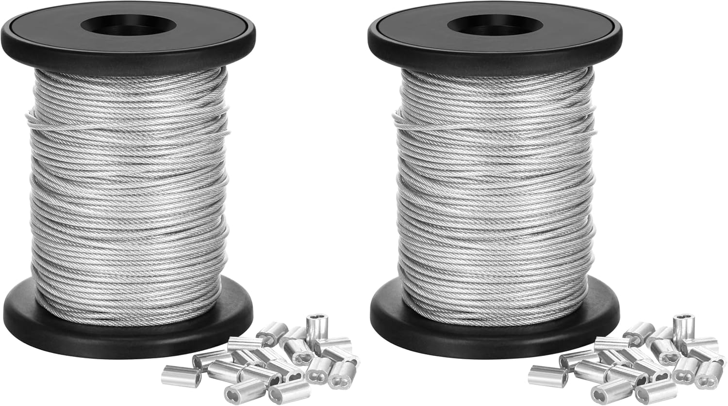 Chengu Vinyl Coated Picture Frame Hanging Wire, Stainless Steel Wire Spool with 20 Pieces Aluminum Crimping Loop Sleeve, Supports up to 110 Lbs (1.5 mm x 98 Feet) (Pack of 2)
